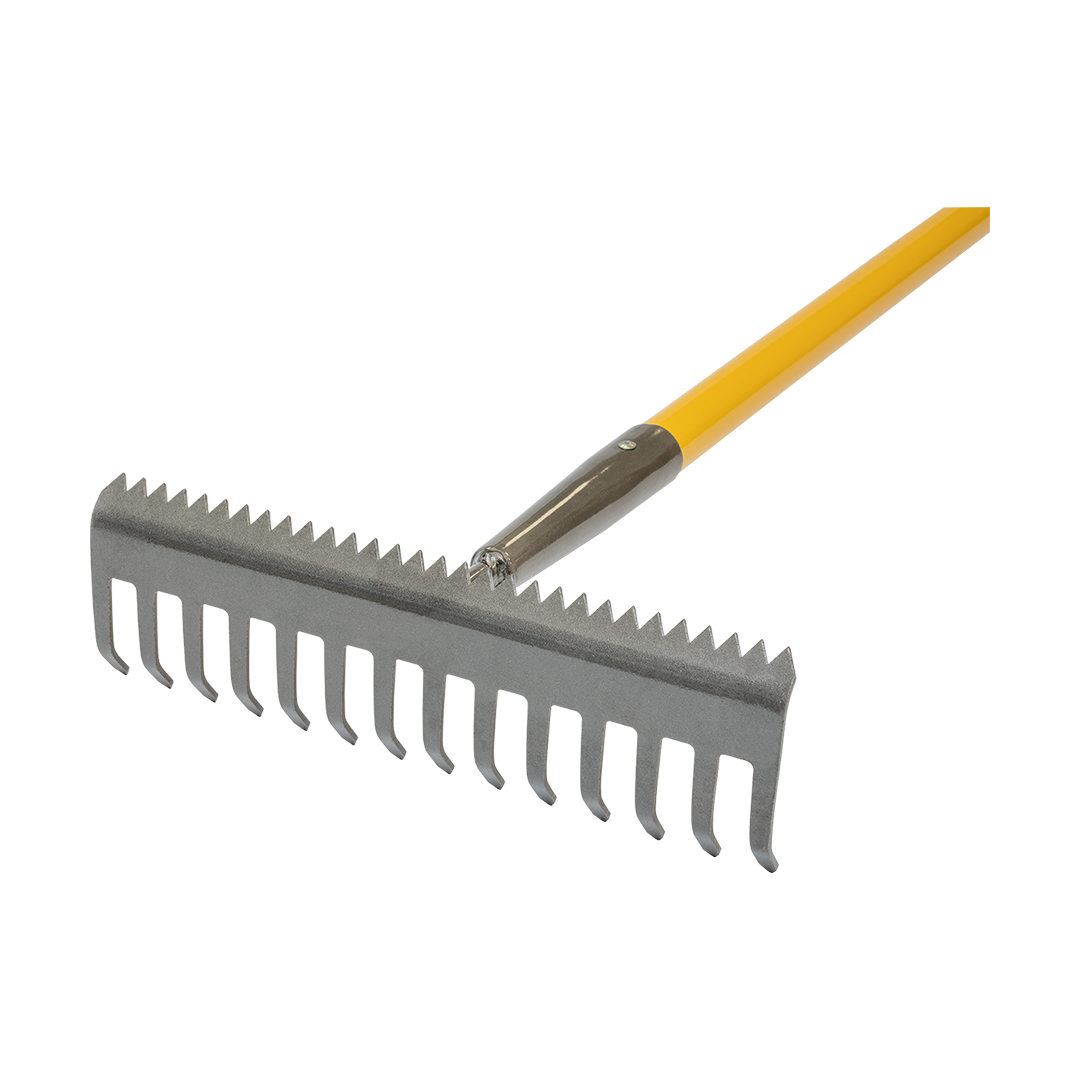 Robust und langlebig, die Roughneck Harke ist aus massivem Kohlenstoffstahl mit einer korrosionsbeständigen Lackierung hergestellt. Sie besitzt einen robusten und langlebigen Glasfasergriff, der nicht durchfeuchtet und verrottet. 14 versenkbare Zinken dringen tief in den Boden ein, lockern ihn auf und verteilen das Erdreich. Die gezahnte Rückseite eignet sich ideal zum Zerkleinern des Bodens in feinere Teilchen, zum Nivellieren und Schaben. Eignet sich ebenfalls zum Verteilen von gröberen Materialien wie Kies, Schotter oder Recycling-Tragschichten.