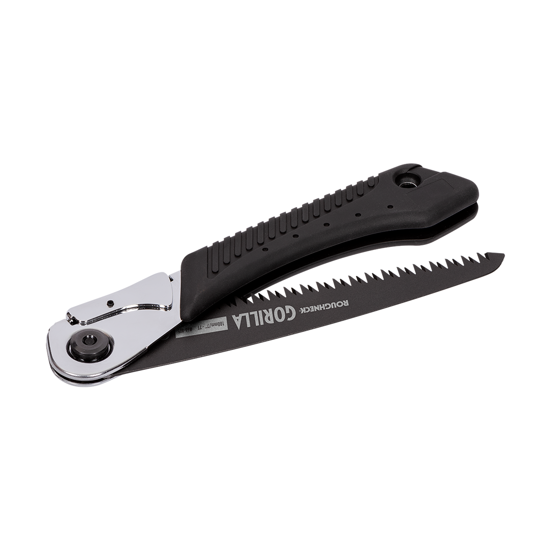 Die Roughneck Gorilla Schnellschnitt-Baumsäge zeichnet sich durch impulsgehärtete, dreifach geschliffene Zähne und eine PTFE-Antihaftbeschichtung für eine außergewöhnliche Schneidleistung aus. Sie ist auf einem verchromten Stahlrahmen aufgebaut, der für Stärke und Haltbarkeit sorgt. Die Klinge rastet sicher ein und klappt sicher weg, wenn sie nicht verwendet wird. Der rutschfeste Gummigriff bietet auch bei nassen Bedingungen einen sicheren und komfortablen Halt. Es wird mit einer Stoffscheide für sicheren Transport und Lagerung geliefert. Ersatzklingen sind erhältlich.