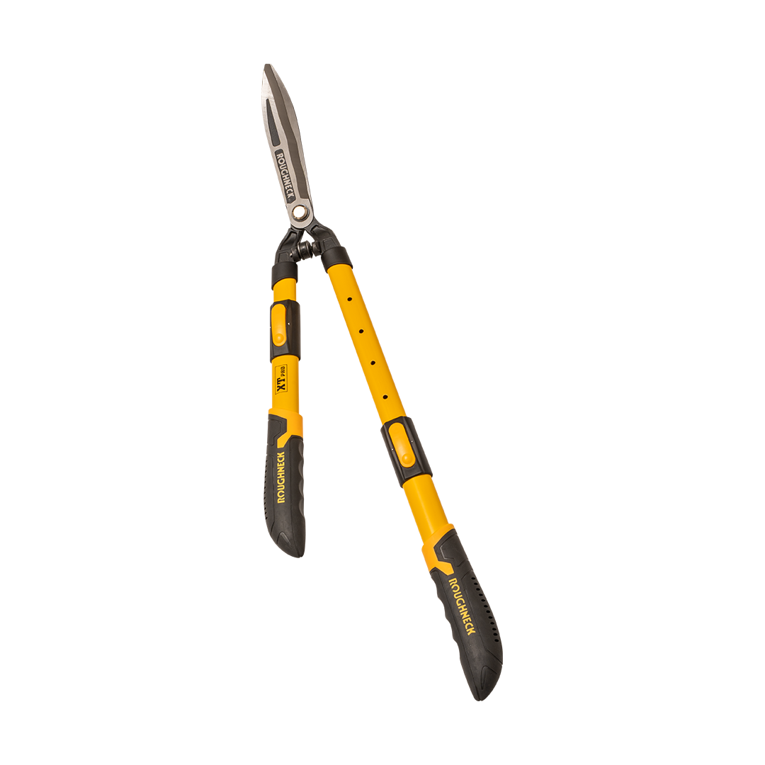 Die Roughneck XT Pro Heckenschere ist gesenkgeschmiedet, um extra Festigkeit zu gewährleisten. Wellenförmige Klingen packen Heckenzweige fest, sie sind aus Kohlenstoffstahl für herausragende Festigkeit und Haltbarkeit hergestellt. Schwerlast-Stahlgriffe bieten maximale Stärke und verfügen über ergonomisch gestaltete Luftkissengriffe für maximalen Komfort.