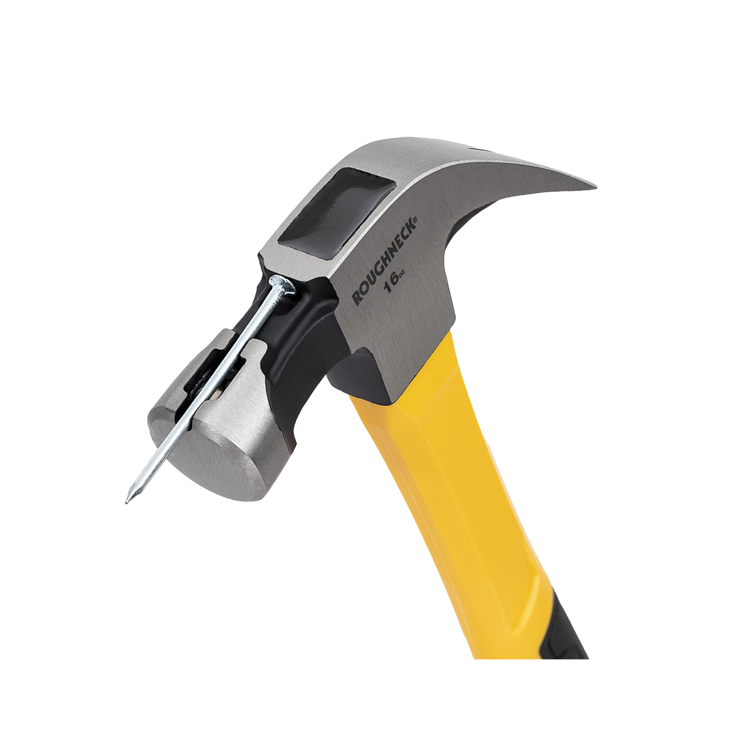 Dieser Roughneck-Klauenhammer (Zimmermannshammer) bietet überlegene Stärke und Sicherheit. Er wird aus geschmiedetem, wärmebehandeltem und gehärtetem Stahl hergestellt. Der epoxidgebundene, solide Glasfaserkerngriff sorgt für eine sichere Verbindung zwischen Kopf und Schaft und einen luftgepolsterten Griff für außergewöhnlichen Komfort und reduzierte Ermüdung. Der magnetische Nagelhalter ermöglicht ein müheloses Ansetzen, insbesondere in schwer zugänglichen Bereichen, während die Mini-Klaue das Entfernen festsitzender Nägel erleichtert. Ein Karabinerloch am Griffboden ermöglicht eine sichere und sichere Befestigung an einem Sicherheitsseil bei Arbeiten in der Höhe.